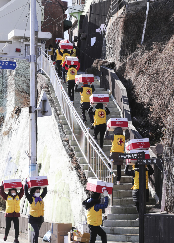 민족의 최대 명절인 설 연휴를 사흘 앞둔 8일 부산 서구 남부민동에서 적십자사 부산지사 봉사자들이 저소득가정에 전달할 구호품을 이고 지고 이동하고 있다. 쌀, 부식 등 생필품으로 구성된 구호품은 홀몸노인, 다문화가정, 한부모가정 등 2300가구에 전달할 예정이다.