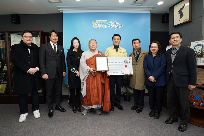 서울 성북구가 최근 대한불교조계종 개운사로부터 코로나19(우한폐렴) 예방을 위한 마스크 1000개와 손세정제 2000개를 기탁받았다. 이날 전달된 물품은 지역내 다중이용시설에 배부될 예정이다. 사진은 이승로 구청장(오른쪽에서 네 번째)과 관계자들의 기념촬영 모습. (사진제공=성북구청)