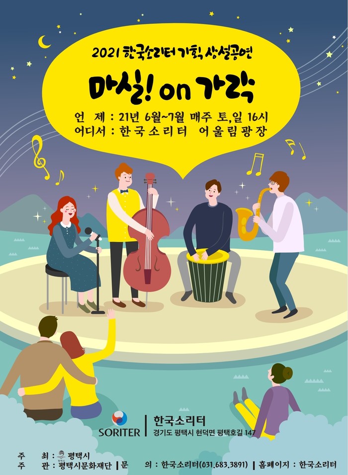 [평택=오왕석 기자] 평택시문화재단(이사장 정장선)이 코로나19로 지친 평택시민들을 위한 상설공연 <마실! On 가락>을 오는 6월 5일부터‘한국소리터 어울림광장에서 개최한다.