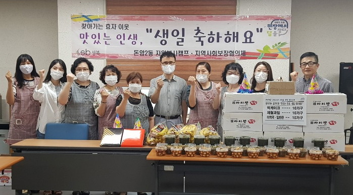 성북구 돈암2동에는 홀몸노인들의 생일상을 차려주기 위해 봉사하는 자원봉사자(돈암2동 자원봉사캠프·지역사회보장협의체·적십자봉사 단원)들이 이웃사랑을 실천하고 있다. 사진은 생일상 봉사에 참여한 자원봉사자들이 기념촬영을 하는 모습. (사진제공=성북구청)