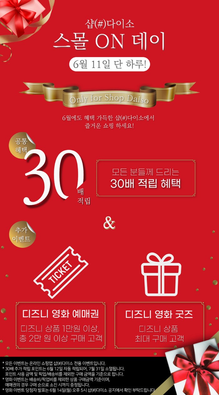 또한, 10만원 이상 구매 고객에게는 다이소 멤버십 5000P를 추가 적립해주고, 디즈니 상품 1만 원 이상 포함해 총 2만 원 이상 구매 고객에게는 디즈니 영화 <루카> 예매권을 소진시까지 증정하는 등 다양한 이벤트를 진행한다. 자세한 사항은 샵(#)다이소 앱을 통해 확인할 수 있다.