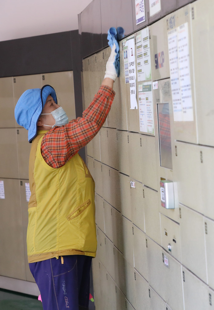 물류센터에서 코로나19 확진자가 잇따라 발생하고 있는 28일 오전 광주 북구 운암1동의 한 아파트단지에서 동행정복지센터 직원들과 지역생활방역단원들이 주민들의 택배 수령 불안감을 해소하기 위해 무인택배함을 방역·소독하고 있다.