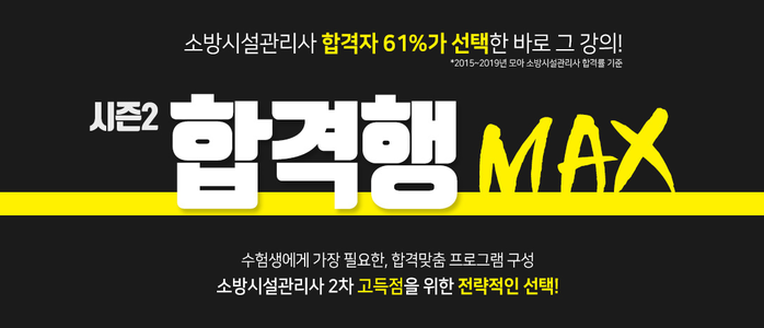 합격행MAX는 수험생에게 가장 필요한 합격맞춤 프로그램으로 구성된 소방시설관리사 2차 시험 고득점을 위한 전략적 상품이다. 3step, 6step 단계별 커리큘럼으로 수험생의 학습단계에 맞춰 선택이 가능하다.
