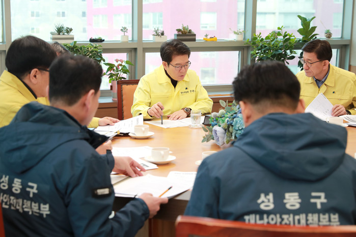 서울 성동구는 최근 코로나19(우한폐렴) 확산 방지를 위해 한양대학교 중국인 유학생 지원을 위한 콜센터 운영 및 유증상자 격리시설 확보 등의 유학생 관리 대책에 관해 논의했다. 사진은 정원오 구청장과 관계자들이 회의하는 모습. (사진제공=성동구청)
