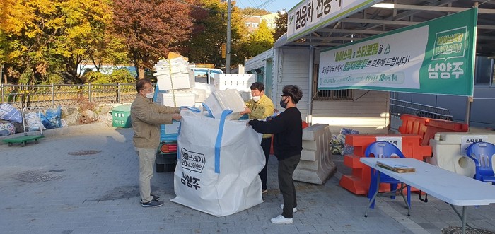 경기 남양주시 오남읍사무소에서는 최근 시에서 추진하고 있는 아이스팩 분리배출 수거사업을 읍민에게 전파하기 위한 적극 행정을 펼치고 있으며 스티로폼 수거를 위해 대형마트와 사전 협의를 하는 등 노력하고 있다. 사진은 대형마트에서 스티로품을 수거하고 있는 모습. (사진제공=남양주시청)