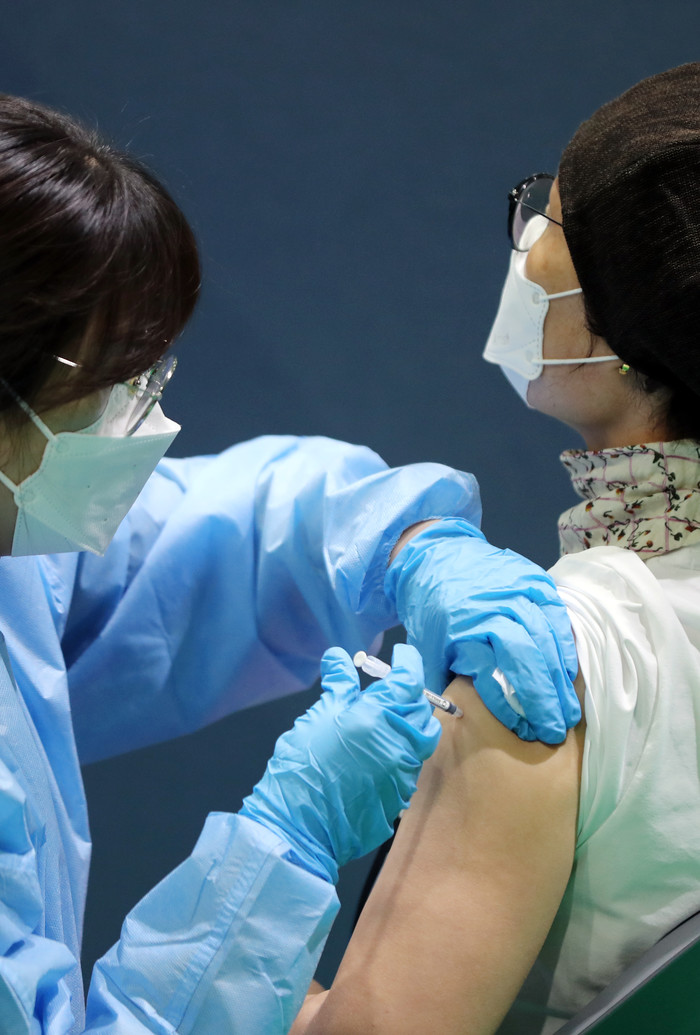 아스트라제네카(AZ) 코로나19 백신 접종이 재개된 12일 오전 광주 북구 예방접종센터에서 특수교육 및 시설 종사자들이 AZ 백신을 접종 받고 있다.