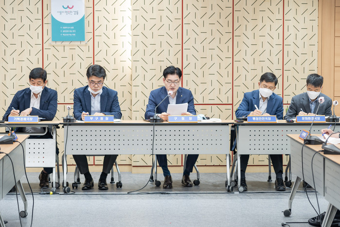 서울 강동구가 최근 이정훈 구청장 주재로 부구청장, 국·소장 등 70여명이 참석한 가운데 '민선 7기 취임 2주년 구청장 공약사업 추진상황 보고회'를 개최했다. 이날 보고회에서는 지난 2년 주요 성과를 점검하고, 공약사업의 추진 방안 등을 논의했다. 사진은 이 구청장(가운데)이 발언하는 모습. (사진제공=강동구청)