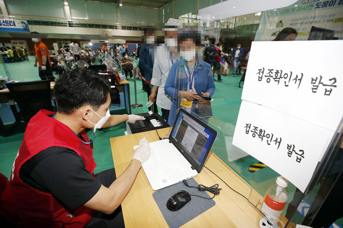 지난 2일 오후 광주 북구 코로나19 백신 예방접종센터에서 직원이 접종을 완료자들에게 예방접종확인서를 발급해주고 있다. 접종 완료자들을 대상으로 경로당과 복지관 등 노인시설을 이용할 수 있는 백신 접종 인센티브 제도가 시행됨에 따라 예방접종 확인서를 발급받는 접종자들이 늘어나고 있다.