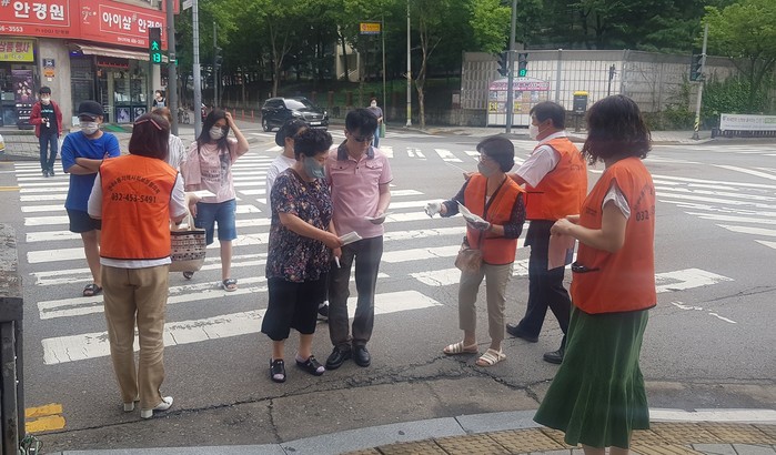 인천 남동구 만수6동 지역사회보장협의체가 30일 지역내 주요 버스 승강장 등을 중심으로 복지사각지대 발굴을 위한 길거리 홍보 캠페인을 펼쳤다. 사진은 이날 협의체 위원들이 주민들에게 홍보물품을 전달하며 캠페인을 전개하는 모습. (사진제공=남동구청)