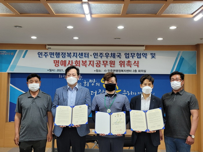 충남 아산시 인주면행정복지센터가 2일 인주우체국과 명예 사회복지공무원 업무협약을 체결하고 집배원 4명을 명예 사회복지공무원으로 위촉했다. 이에 따라 이날 위촉된 집배원들은 복지사각지대에 놓인 취약가구를 발굴·지원하는 역할을 하게 된다. 사진은 협약식에서 관계자들이 기념촬영을 하는 모습. (사진제공=아산시청)