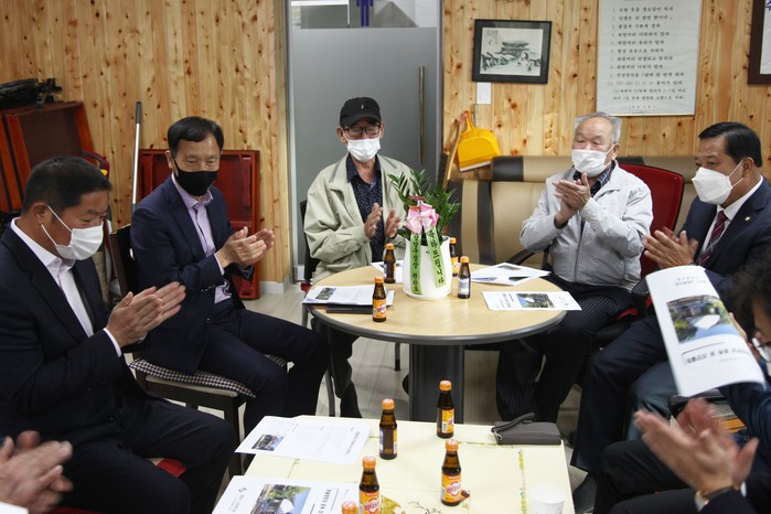 경기 수원시 팔달구는 28일 지역내 노인들을 위한 행궁동 팔창경로당 및 지동 못골경로당 리모델링 준공식을 개최했다. 이번 준공식은 코로나19로 인해 간소화게 간담회 형식으로 행사가 진행됐다. 사진은 행사에 참석한 권찬호 구청장(왼쪽 두 번째), 관계자 및 노인들이 박수를 치고 있는 모습. (사진제공=팔달구청)