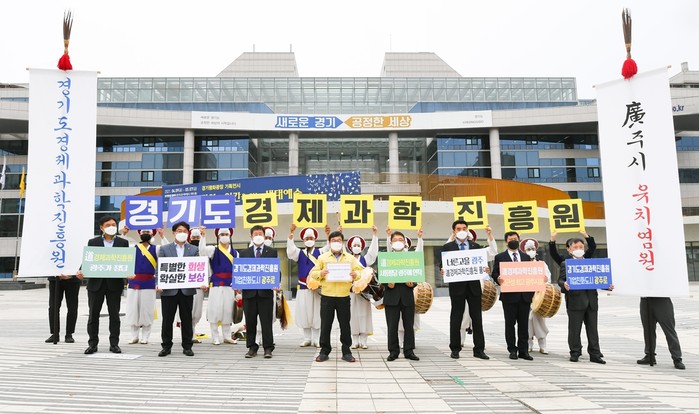 신동헌 경기 광주시장은 12일 시립광지원농악단 30여명과 경기도청 북부청사를 찾아 경기도경제과학진흥원 유치 제안서를 제출하고 ‘경기도경제과학진흥원 모시기’라는 주제로 현장 퍼포먼스를 벌였다. 사진은 신 시장이 농악대와 함께 경기도경제과학진흥원 광주 유치를 기원하는 퍼포먼스를 하고 있는 모습. (사진제공=광주시청)