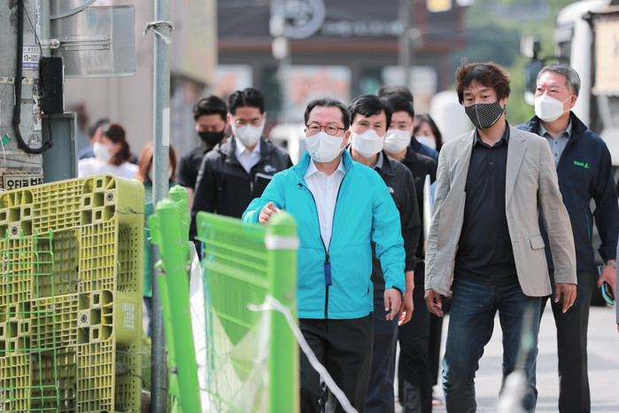 조광한 경기 남양주시장이 28일 화도읍 가곡리 도로 확장 공사와 관련된 주민 건의 사항을 확인하기 위해 민원 현장을 방문했다. 이날 조 시장은 현장에 도착해 관계 공무원들과 함께 가곡1리 초입 도로부터 사업 시행이 예정돼 있던 보광사 진입 도로까지 도보로 이동하며 도로 상황을 확인하고 가곡리 주민들의 의견을 청취했다. 사진은 조 시장이 관계자들과 함께 현장을 살피는 모습. (사진제공=남양주시청)