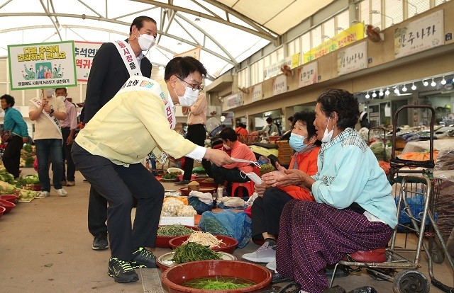 한편, 군은 코로나19 지역사회 유입을 방지하기 위해 전통시장 방역과 함께 이용객들에 대한 거리 두기 및 마스크 착용 의무화에 따른 계도 활동을 꾸준히 전개해 오고 있다. 추석 명절을 맞아 전통시장에 마스크 4,560개, 손소독제 60개를 배포했다,