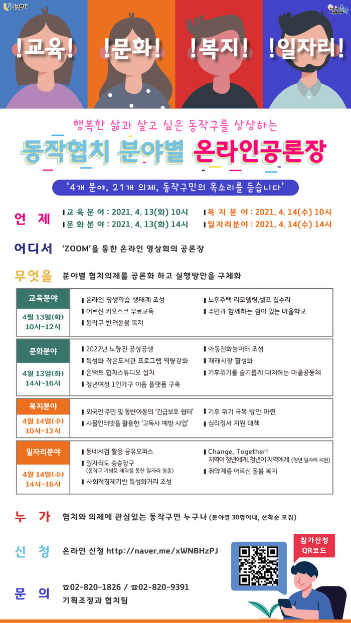 협치와 의제에 관심있는 구민은 누구나 분야별 30명 이내로 선착순으로 참여할 수 있으며, 온라인이나 포스터 하단에 있는 참가신청 QR코드를 통해 신청가능하다.