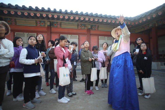서울 강서구 '꿈동산 어린이기자단'은 30일 경복궁에 방문해 문화해설사로부터 경복궁의 역사와 문화에 대한 설명을 들으며 궁궐 곳곳을 둘러봤다. 사진은 경복궁에 방문한 어린이기자들이 경복궁을 살펴보며 설명을 듣고 있는 모습. (사진제공=강서구청)