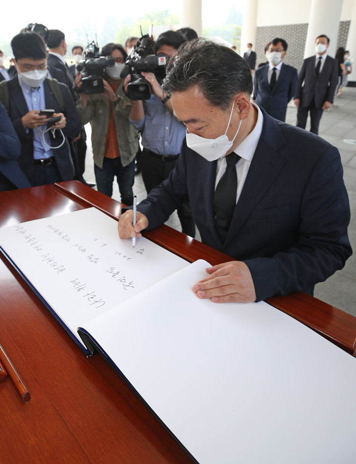 김오수 신임 검찰총장이 2일 오전 서울 동작구 국립서울현충원을 찾아 참배를 마친 뒤 방명록을 작성하고 있다. 김 총장은 "나라 위해 헌신하신 애국충정 받들어 국민 중심 검찰 받드시 만들겠습니다"라고 기록했다.