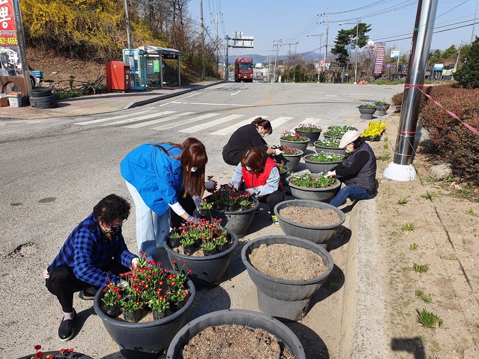 경기 양주시 은현면 주민자치위원회가 최근 경기도 공공기관 3차 이전 유치 염원을 담은 '새봄맞이 꽃심기' 행사를 개최했다. 이날 위원회 회원들은 화분 110여개에 봄꽃인 팬지·데이지 등 다양한 꽃을 심어 도로를 아름답게 조성했다. 사진은 화분에 꽃을 심고 있는 모습. (사진제공=양주시청)