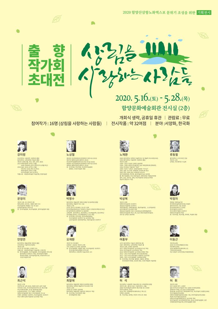 함양문화예술회관은 함양문화예술 발전을 위해 부산·김해지역에서 활동하는 출향작가들을 초청하여 16일부터 28일까지 출향 작가회(상림을 사람하는 모임) 초대전을 연다.