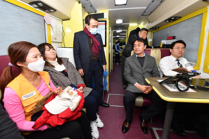 김상호 경기 하남시장이 코로나19(우한폐렴) 여파로 혈액 수급이 줄어들고 있는 가운데 18일 공직자 40여명과 함께 시청 정문 헌혈버스에서 열린 '사랑의 헌혈봉사' 행사에 동참했다. 사진은 김 시장 및 직원들이 헌혈 전 이야기를 나누는 모습. (사진제공=하남시청)