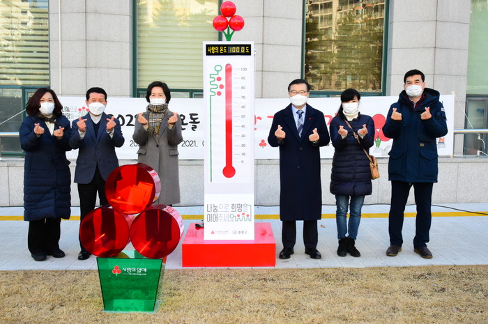 서울 중랑구는 지난 23일 중랑구민광장에서 2021 희망온돌 따뜻한 겨울나기 사업을 위한 ‘사랑의 온도탑’ 설치 행사를 진행했다. 희망온돌 따뜻한 겨울나기는 지역내 어려움을 겪는 이웃을 위해 주민들이 성금을 모아 기부하는 대표적인 겨울철 이웃돕기 사업이며, ‘사랑의 온도탑’은 겨울나기 모금 목표액의 1%에 해당하는 금액이 모금될 때마다 수은주가 1도씩 올라 목표액에 달성하면 100도가 되는 탑이다. 사진은 류경기 구청장(오른쪽 세 번째)이 참여자들과 기념촬영을 하는 모습. (사진제공=중랑구청)