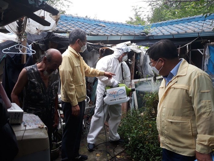 경기 남양주시 진건읍 지역사회보장협의체는 최근 수도권 코로나19 집단 확진자 발생과 집중호우로 인한 개인 위생이 중요해짐에 따라 방역의 손길이 닿지 않은 비정형·수재민 가구 15곳을 대상으로 방역소독을 실시했다. 사진은 협의체 관계자들이 방역을 하고 있는 모습. (사진제공=남양주시청)