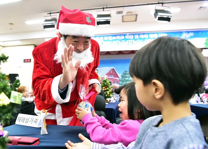 경기 안산시는 최근 시청 대회의실에서 드림스타트 아동 및 가족과 함께하는 ‘2019년 드림스타트 크리스마스 산타 잔치’를 성황리에 마쳤다. 사진은 ‘아재 산타’로 깜짝 등장한 윤화섭 시장이 아이들에게 사탕을 나눠주고 인사를 나누는 모습. (사진제공=안산시청)
