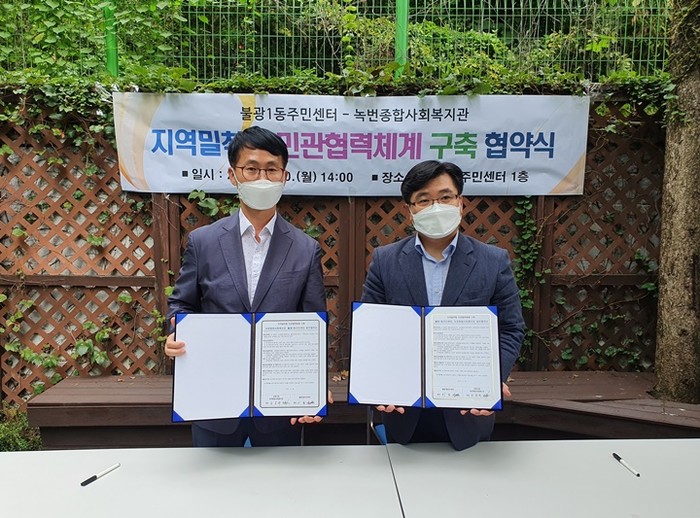 서울 은평구 불광1동은 최근 녹번종합사회복지관과 ‘지역밀착형 민관협력체계 구축’ 협약을 체결했다. 이번 협약으로 양 기관은 ‘지역 속으로 지역, 쏙! 쏙!’이라는 주제로 찾동과 복지관의 협력을 강화해 더욱 촘촘한 복지생태계를 조성하기로 했다. 사진은 협약식에서 관계자들이 기념촬영을 하는 모습. (사진제공=은평구청)