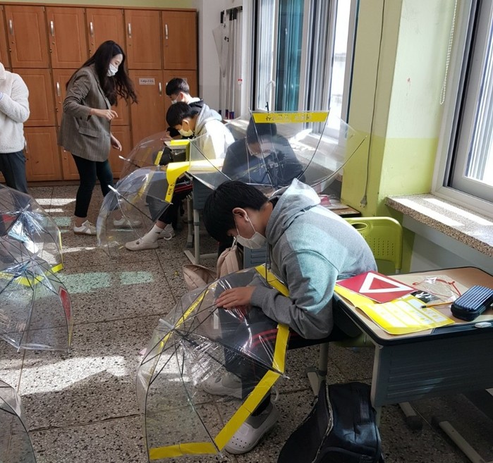 강동구 둔촌2동에서 최근 둔촌중학교 학생들이 직접 만든 안전우산 200개를 지역내 어린이집 11곳 재원 아동들에게 선물했다. 안전우산은 투명으로 시야를 확보할 수 있으며, 테두리에 노란색 띠를 부착했다. 사진은 둔촌중학교 학생들이 어린이 교통안전을 위해 투명 안전우산을 만들고 있는 모습. (사진제공=강동구청)
