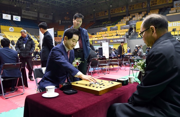 경기 의정부시체육회가 주최하고 의정부시바둑협회가 주관하는 '제18회 의정부시 회룡배 전국 바둑대회'가 8일 의정부체육관에서 임원 및 참가선수 등 약400여명이 참석한 가운데 개최됐다. 사진은 안병용 시장(왼쪽)이 바둑을 두고 있는 모습. (사진제공=의정부시청)