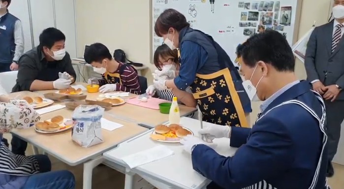이승로 서울 성북구청장이 최근 제41회 장애인의 날을 맞아 성북장애인복지관과 장애인 직업재활시설인 해피워크를 방문해 장애인들과 소통했다. 사진은 이 구청장(오른쪽)이 성북장애인복지관에서 진행하는 주간활동서비스 요리수업에 참여해 발달장애인들과 샌드위치를 만드는 모습. (사진제공=성북구청)
