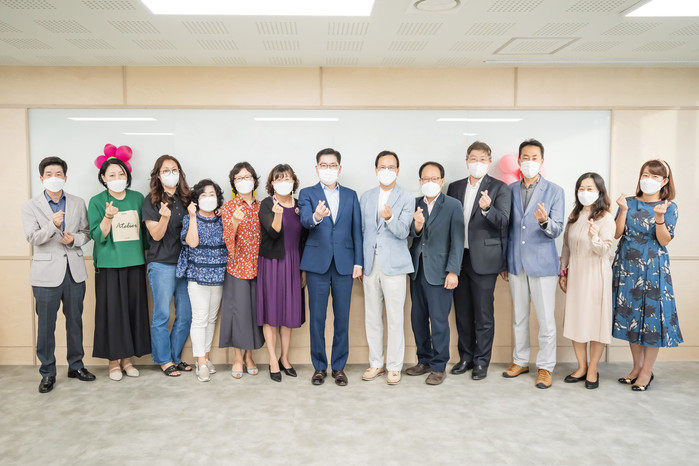 서울 강동구 성내1동 주민센터는 최근 유휴공간 리모델링을 통해 대강의실·소강의실·복지상담실을 조성하고 작은도서관을 확장·이전하는 공사를 완료했다. 사진은 23일 이정훈 구청장(가운데)이 성내1동 주민센터 유휴공간 리모델링 시설을 방문해 관계자들과 기념촬영을 하고 있는 모습. (사진제공=강동구청)