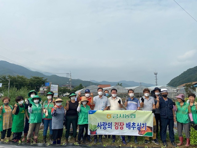 경기 여주시 금사면·산북면 부녀회는 26일 금사농협 협조로 금사농협산지점 옆 밭(1882㎡)에서 가을 김장김치용 배추심기 행사를 열어 김장배추 모종 3300포기와 김장김치 담글 때 사용할 파와 무도 함께 파종했다. 사진은 이날 봉사자들이 기념촬영을 하고 있는 모습. (사진제공=여주시청)