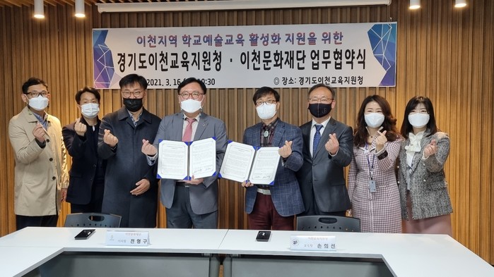 경기도 이천교육지원청은 16일 이천 학교문화예술교육 활성화를 위해 이천문화재단과 업무협약을 체결했다. 협약으로 두 기관은 학교문화예술교육 프로그램 연계 협력 등을 수행하며, 정례적 협의회를 운영하기로 했다. 사진은 협약식에서 관계자들이 기념촬영을 하는 모습. (사진제공=이천교육지원청)