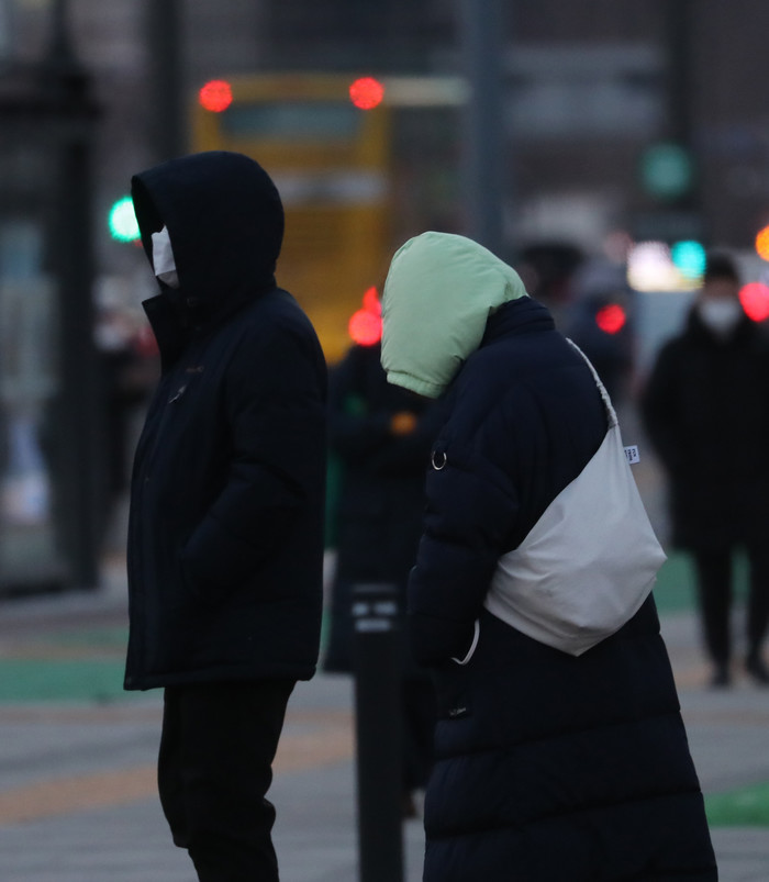 절기상 입춘(立春)인 3일 오전 서울 최저기온이 영하 9도까지 내려갔다. 서울 광화문 네거리에서 직장인들이 두꺼운 방한복을 입고 움츠린 모습으로 출근하고 있다.