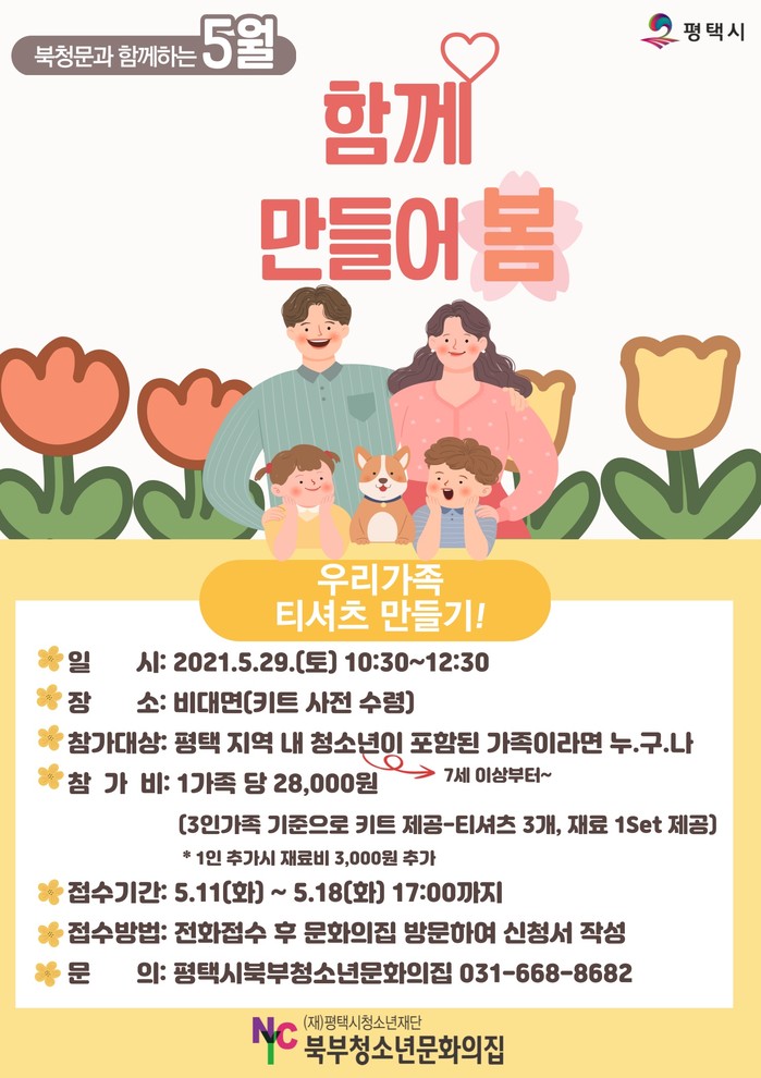 ‘함께 만들어 봄’은 평택 지역 내 청소년이 포함된 가족이라면 누구나 참가 가능한 활동으로 우리 가족만의 티셔츠 만들기를 통해 청소년과 가족이 함께해 가족 간의 정서적인 유대감을 형성하고 협동심을 통해 가족 관계증진을 향상시키며 원활한 소통을 통해 참된 가족의 의미를 되새겨 볼 수 있다.