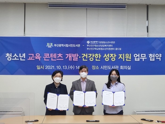 이번에 시민도서관과 업무협약을 체결하는 기관은 부산광역시양정청소년수련관(관장 박용하)과 부산진구청소년상담복지센터.부산진구학교밖청소년지원센터 꿈드림(센터장 장문숙)이다.