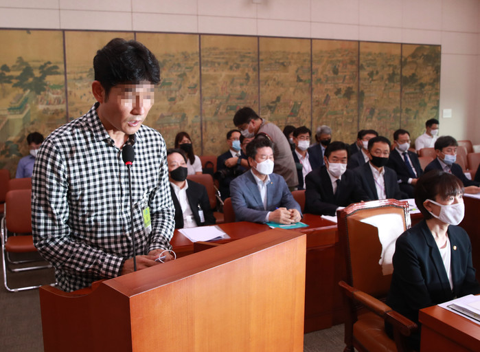 6일 오전 서울 여의도 국회에서 열린 문화체육관광위원회 전체회의에서 김규봉 경주시청 트라이애슬론(철인3종경기)팀 감독이 질의에 답하고 있다.