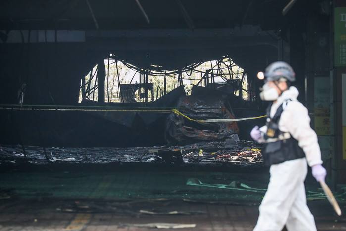 11일 오전 경기도 남양주시의 한 주상복합건물에서 차량이 전소돼 있다. 전날 오후 이곳 1층 상가에서 화재가 발생해 큰 인명피해 없이 10시간 만에 진화됐다.