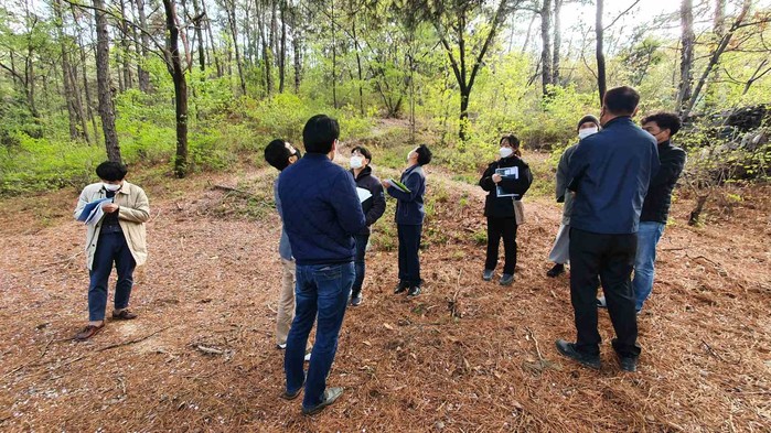 경기 수원시 권선구는 13일 산림 연접지 주요 사찰(용화사), 칠보산 학술림 등을 산불위험으로부터 보호하기 위한 ‘권선구 산불소화시설 설치사업’ 설계심의회를 개최했다. 사진은 칠보산 용화사 부근 현장에서 관련 관계자들이 심의를 진행하고 있는 모습. (사진제공=권선구청)