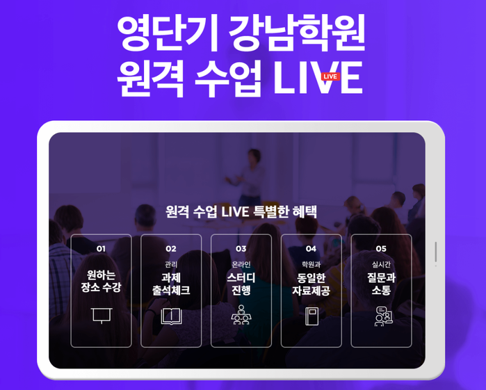 온라인 개학이 시행되고 비대면 학습을 선호하는 경향이 높아지는 가운데, 어학 학원 강좌도 ‘늘온강(늘 온라인 강의) 시대‘라는 새로운 변화에 발맞춰 학원의 현장감과 온라인 강의의 편의성을 결합한 형태의 ‘원격 수업 라이브’ 강좌를 선보인 것이다.