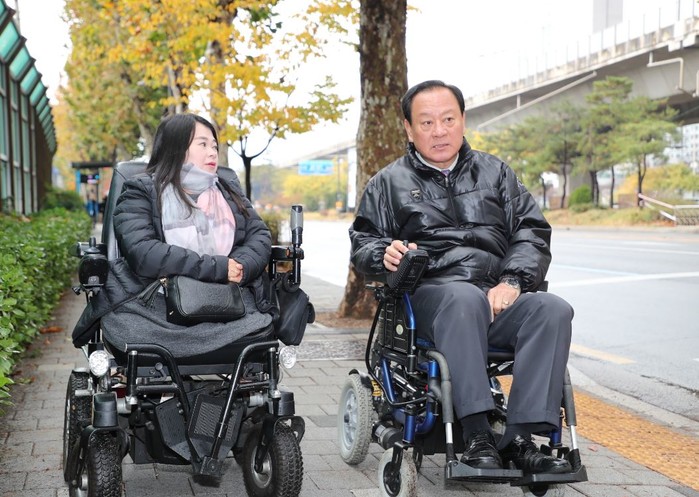 서울 마포구가 최근 '찾아가는 민생현장탐방'의 일환으로 '장애인과 함께 차별 없는 안전한 공공시설 이용 체험' 행사를 열고 전동휠체어 체험, 소통의 시간 등을 진행했다. 사진은 유동균 구청장이 장애인 김수진씨(36·여)와 휠체어 체험을 하는 모습. (사진제공=마포구청)