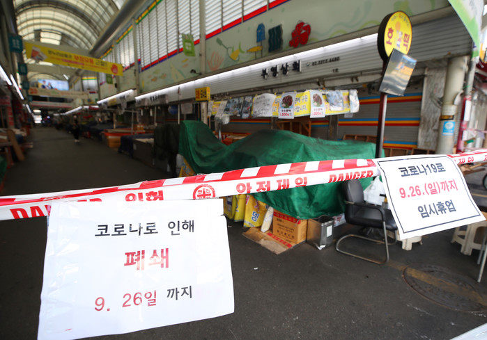 26일 오전 코로나19 집단감염 발생으로 폐쇄된 서울 중구 중부시장에 출입을 통제하는 안전선이 설치돼 있다. 한편, 중앙방역대책본부에 따르면 이날 오전 0시 기준 신규 확진자 수는 주말임에도 불구하고 역대 두 번째로 많은 2771명을 기록해 누적 확진자 수는 30만1172명으로 집계됐다.