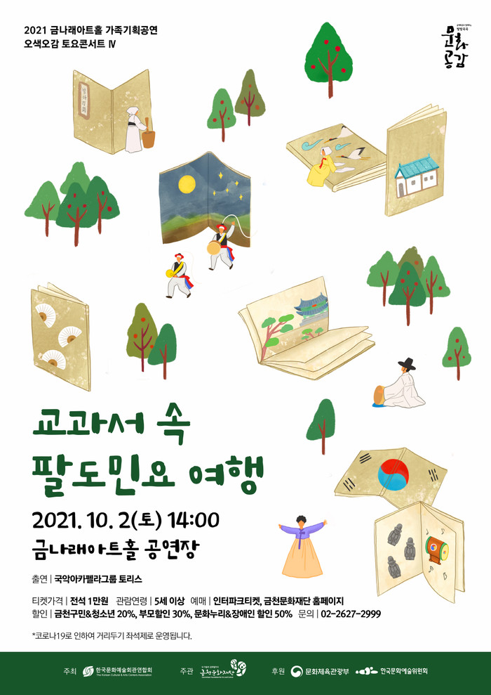 먼저 10월 2일 오후 2시에 금나래아트홀 상주단체 ‘토리스’가 공연하는 ‘오색오감 토요콘서트 교과서 속 팔도민요 여행’이 개최된다. 초등학교 교과서에 수록된 전통민요를 아카펠라로 새롭게 재해석한 창작 음악극으로, 국악과 서양 아카펠라가 결합된 색다른 매력을 느낄 수 있다.