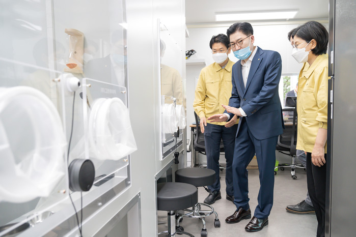 이정훈 강동구청장이 1일 민선7기 2년 첫날 행보로 이른 아침 선별진료소와 치매안심센터를 방문해 코로나19 대응에 고생하는 현장근로자들을 격려했다. 사진은 이 구청장이(가운데) 보건소 본관 뒤편에 설치한 ‘이동형 선별진료소’를 찾아 ‘글로브월(Glove Wall)’을 살펴보고 있는 모습. (사진제공=강동구청)