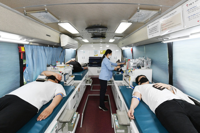 경기 양주시가 14일 시청 앞 원형광장에서 소속 직원과 방문 시민들을 대상으로 코로나19 극복을 위한‘감동 헌혈 캠페인’을 전개했다. 사진은 캠페인 참여자들이 헌혈을 하고 있는 모습. (사진제공=양주시청)