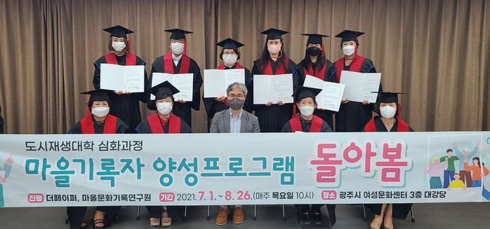 경기 광주시가 최근 도시재생대학 심화과정 마을기록자 양성프로그램 ‘돌아봄’ 수료식을 열었다. 프로그램을 수료한 마을기록자 15명은 지역 곳곳을 찾아다니며 지역 역사와 마을주민의 삶을 다양하게 기록해 되살리기 위한 활동을 펼칠 예정이다. 사진은 수료식에서 수료자들이 기념촬영을 하는 모습. (사진제공=광주시청)