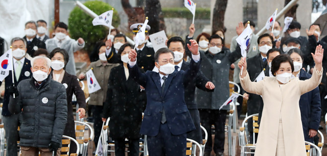 문재인 대통령이 1일 오전 서울 종로구 탑골공원에서 열린 제102주년 3.1절 기념식에서 참석자들과 함께 만세삼창을 하고 있다.