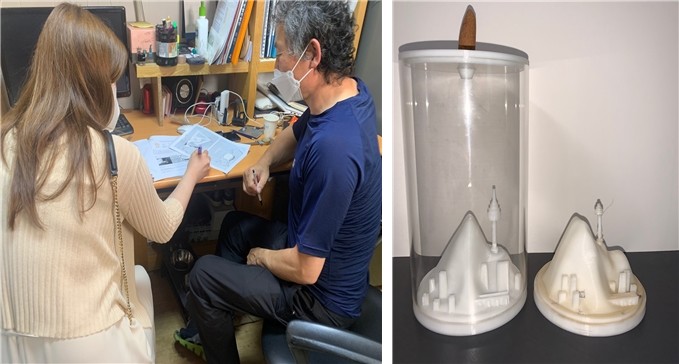 | ▲ ‘유니크엔커먼’ 팀과 문래동 기계금속 장인이 이야기하고 있는 모습(왼쪽)과 협업으로 탄생한 시제품 사진(오른쪽) (사진제공=영등포구청) |