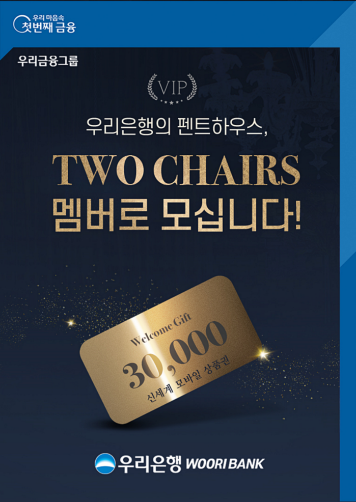 우리은행 프라이빗뱅킹 브랜드인 TWO CHAIRS는 반기 금융수신 평잔 1억원 이상이면 선정되며 세무, 부동산, 자산관리 전문가의 고객 맞춤형 자문서비스는 물론, ▲전용상담 공간 제공 ▲해외 유학·이주 상담서비스 ▲대여금고 무료 사용 등 다양한 혜택을 선정일로부터 6개월 동안 제공한다.